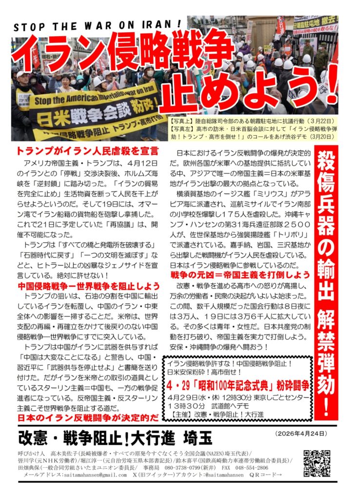イラン侵略戦争が激しさを増し、まさに世界戦争・核戦争の危機が迫っています。日本はイラン侵略戦争の当事国です。高市の手はトランプ同様、血にまみれています。そして、中国侵略戦争の最前線である「第1列島線」での主力を担うという選択に踏み込もうとしています。中国―アジアで2千万人を虐殺した侵略と戦争の歴史を居直り、再び中国侵略戦争を行うなど絶対に許すことはできません。