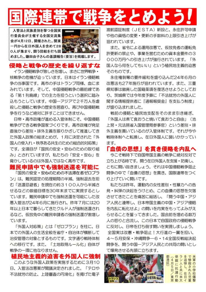 今こそ戦時下で自国帝国主義の戦争に絶対反対で立ち上がる時です。闘う在日外国人を支援・防衛し、ともに闘い抜きましょう。それは中国侵略戦争阻止闘争の中で「血債の思想」を貫き、国際連帯をつくり上げていく闘いです。